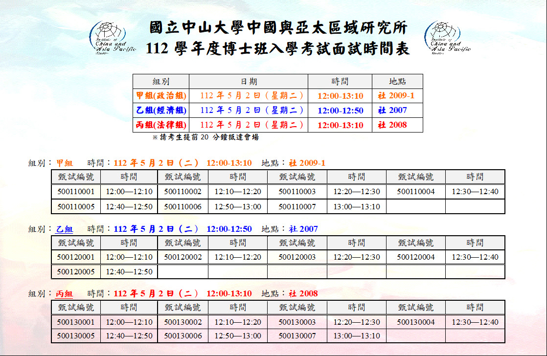 一、面試時間及地點(1) 面試日期:111 年 5 月 2 日 (星期二)。 (2) 面試地點:社會科學院 2 樓 中山大學中國與亞太區域研究所 。 敬請依規定所屬時間攜帶相關資料及身分證件,提前20分鐘抵達會場參加面試。 請自行列印應考證-應考證列印處