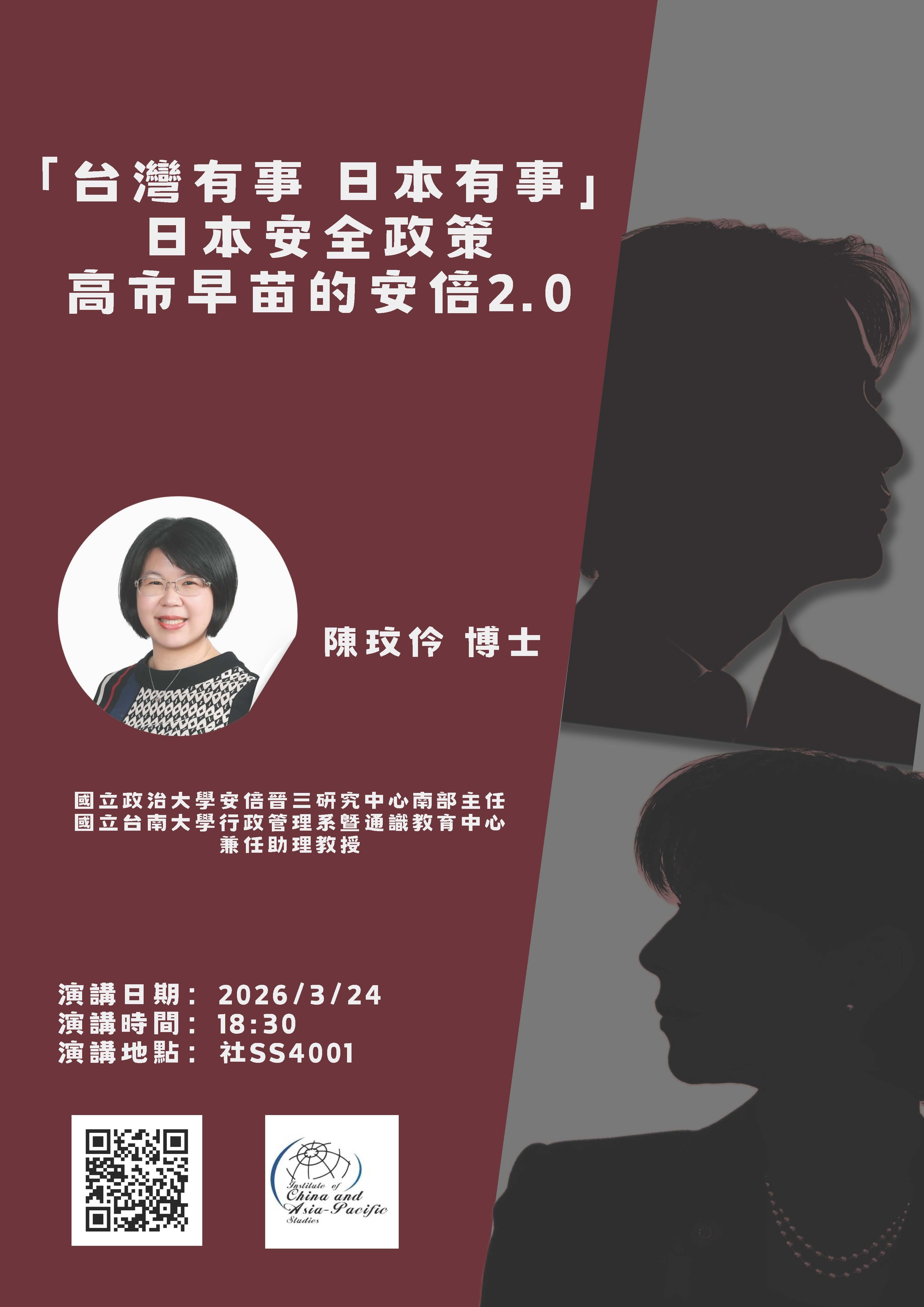 【專題講座】3/24 陳玟伶博士 (國立台南⼤學⾏政管理系暨通識教育中⼼兼任助理教授)專題演講-「台灣有事 日本有事」日本安全政策高市早苗的安倍2.0