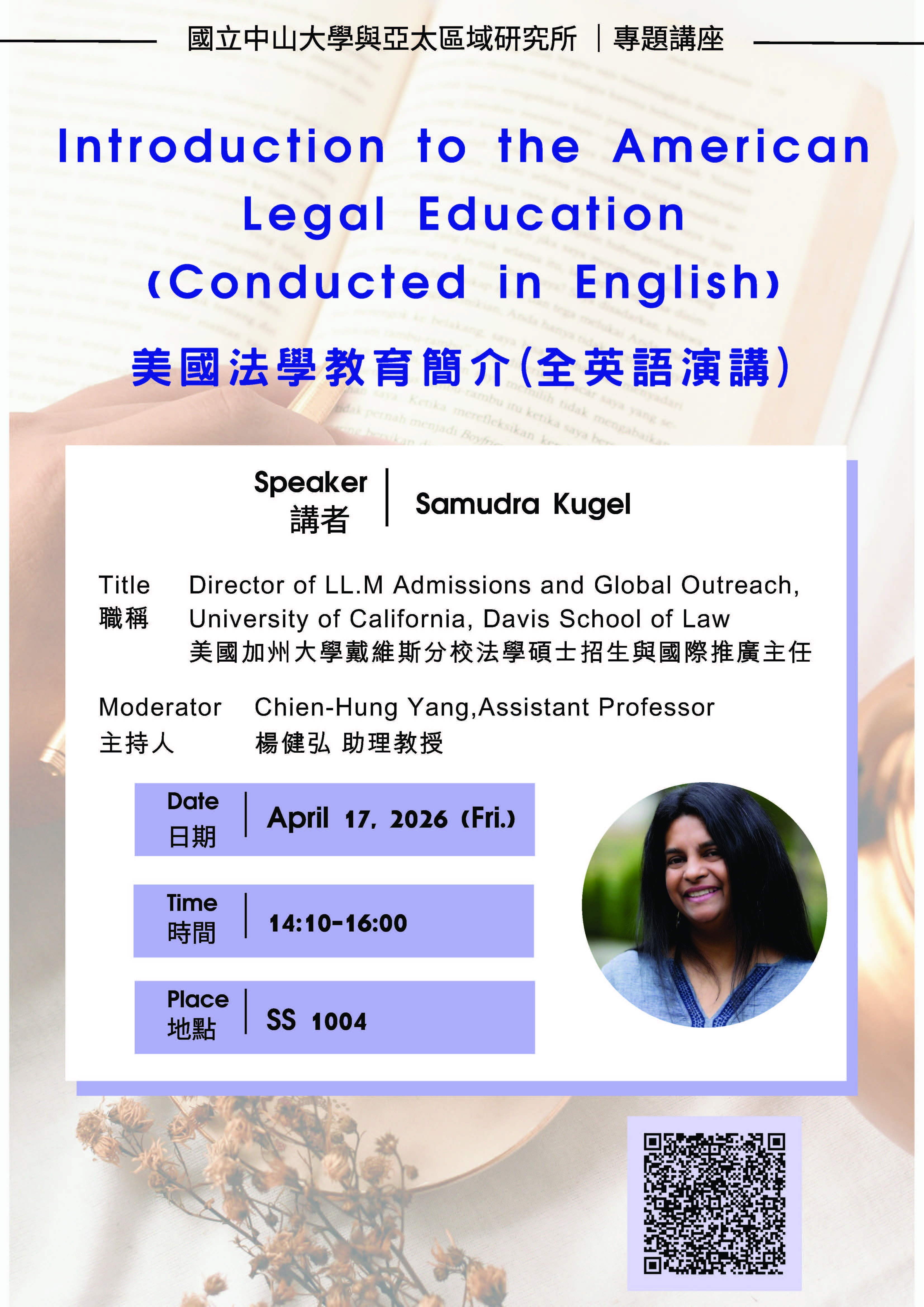 【專題講座】4/17 Samudra Kugel (美國加州大學戴維斯分校法學碩士招生與國際推廣主任)-美國法學教育簡介(全英語演講)