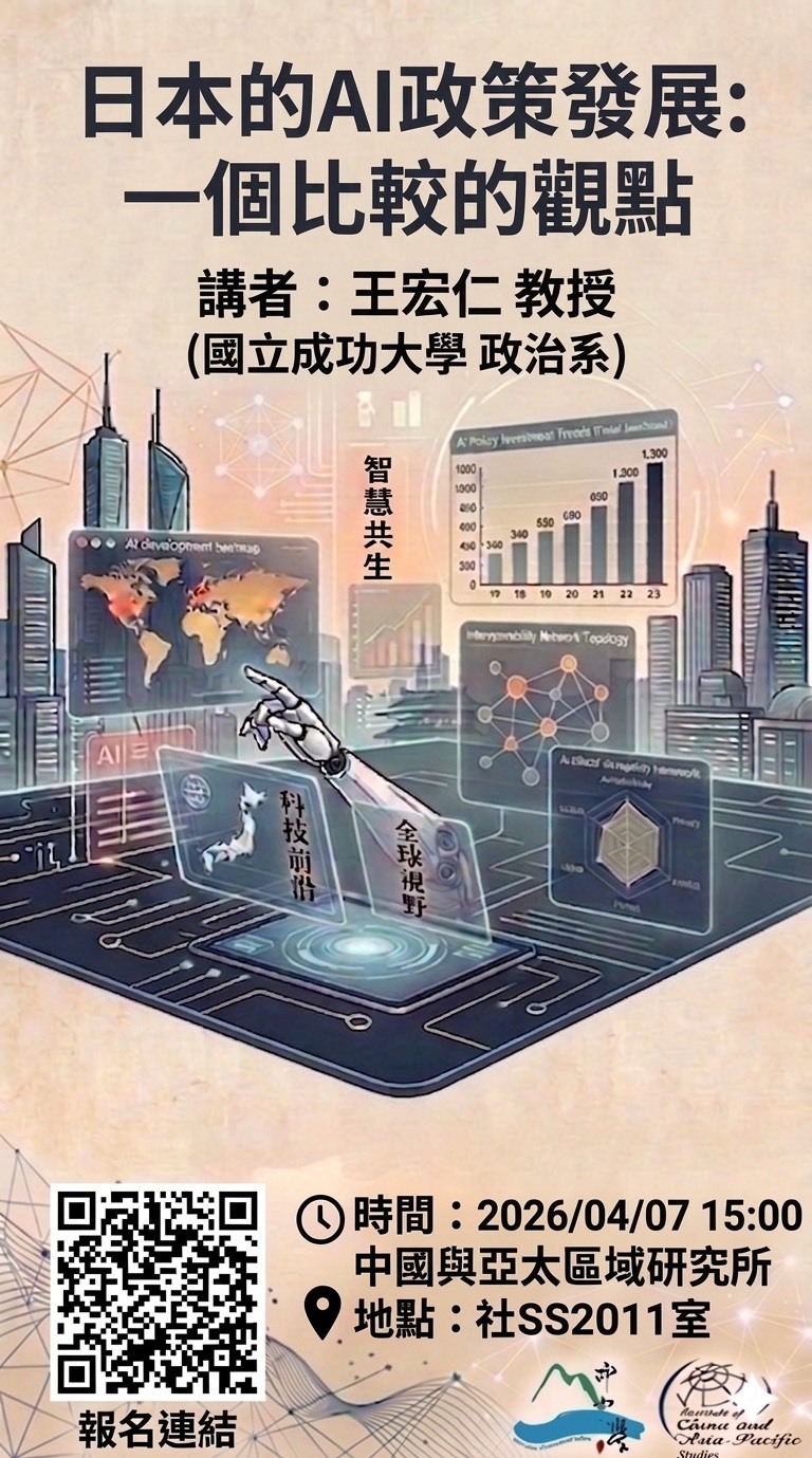 【專題講座】4/07 王宏仁教授 (國立成功大學 政治系)專題演講-日本的AI政策發展:一個比較的觀點