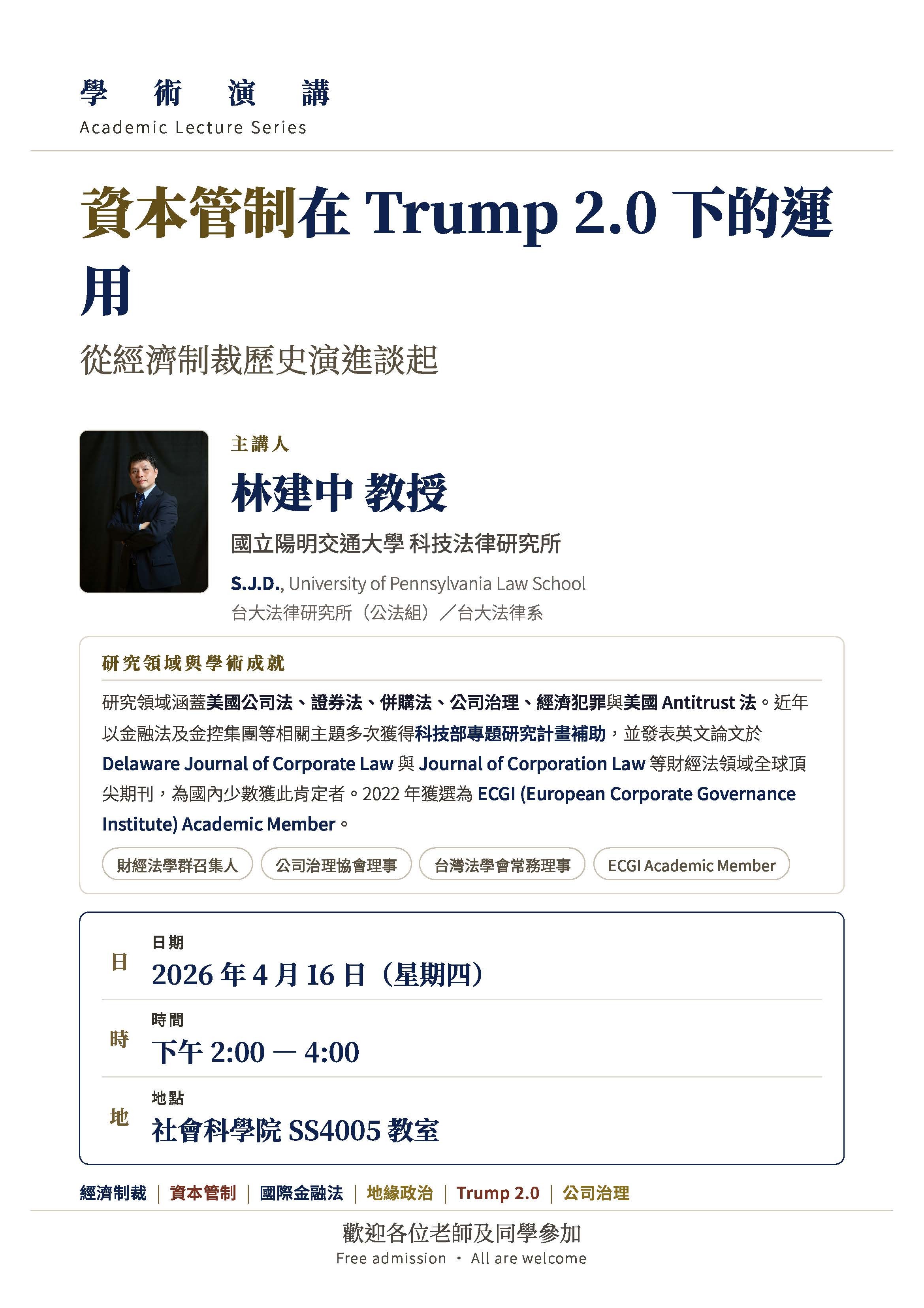 【專題講座】4/16 林建中教授(國立陽明交通大學 科技法律研究所)專題演講-資本管制在 Trump 2.0 下的運用 從經濟制裁歷史演進談起